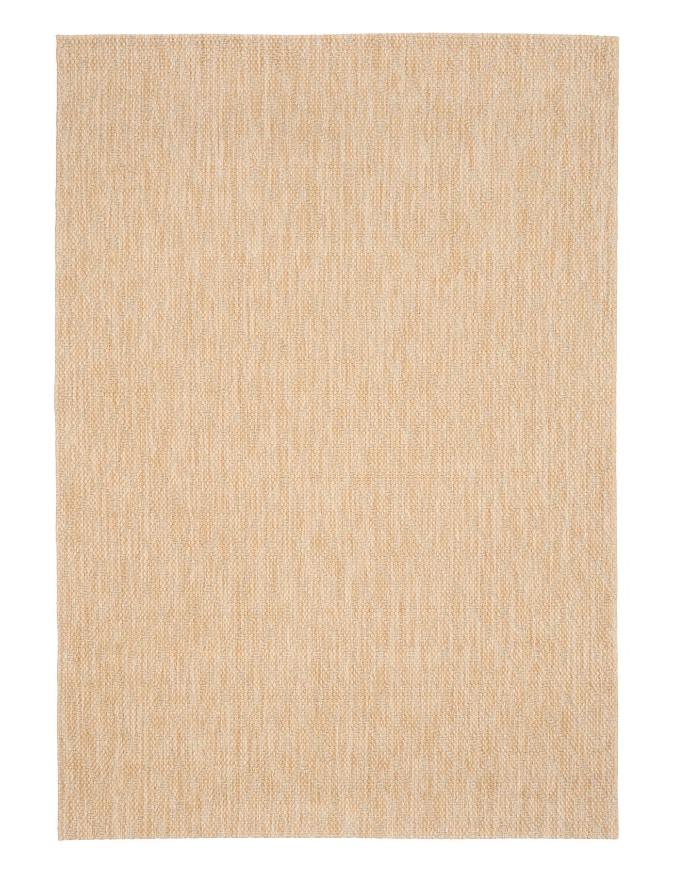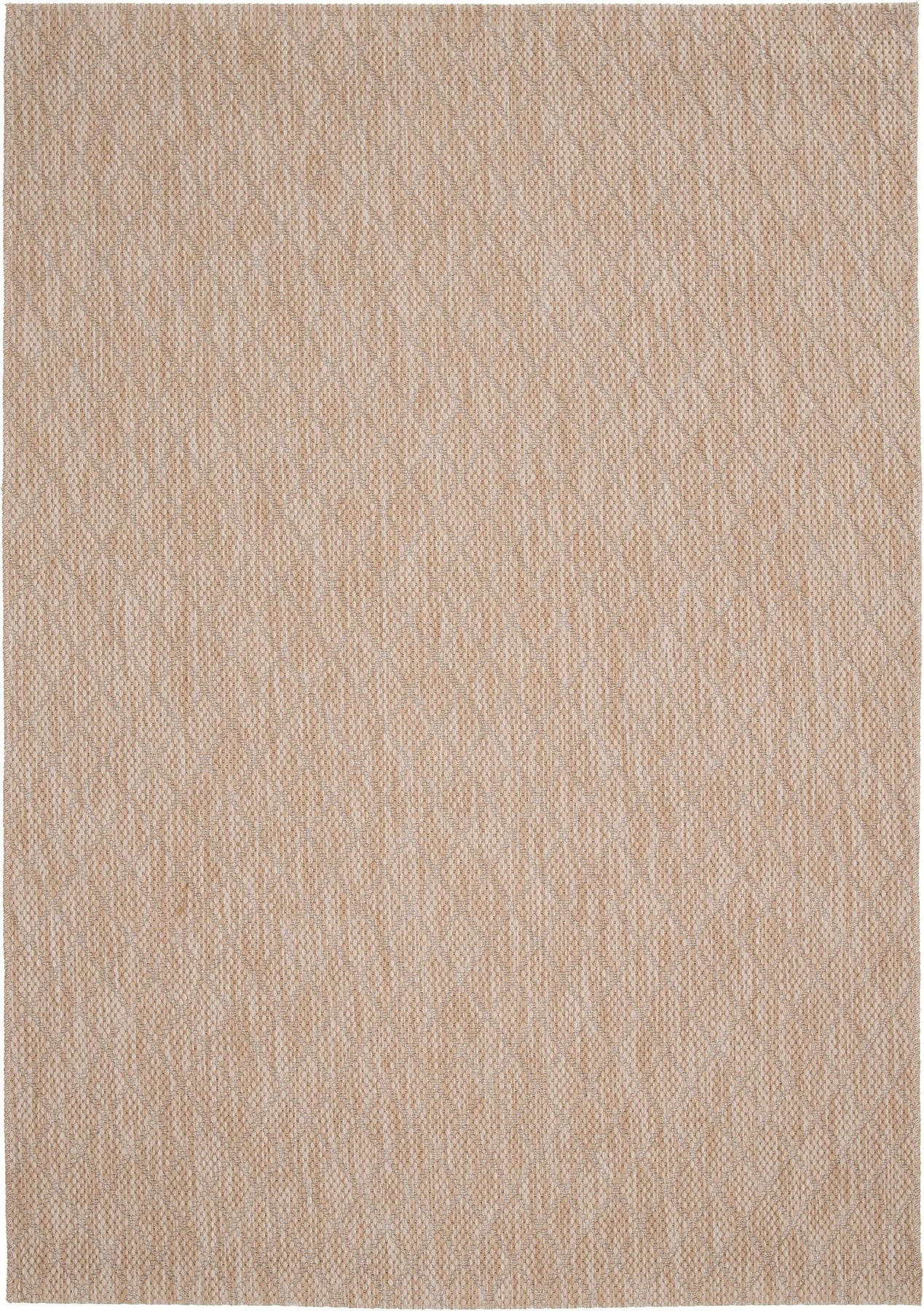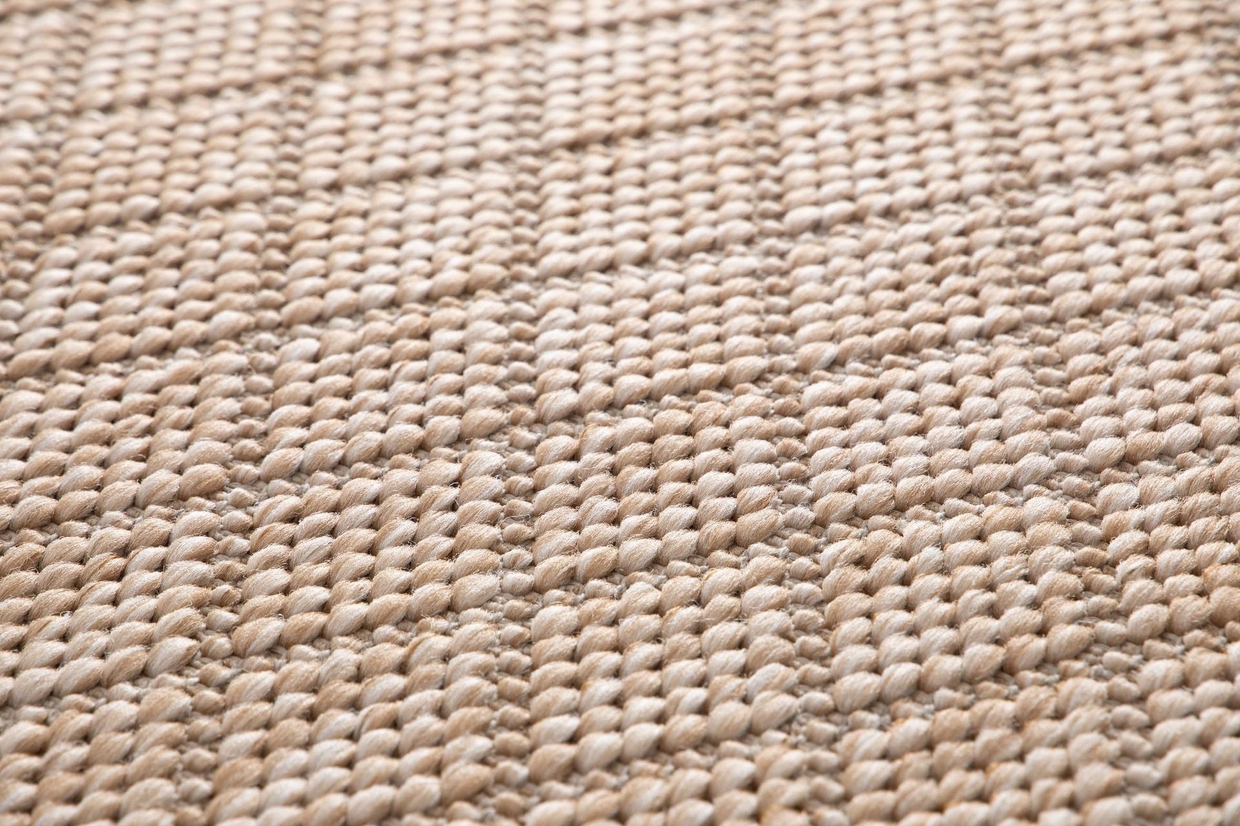 Featuring a modern, stylish design, it’s an ideal choice for creating a seamless flow between your indoor and outdoor living areas. Whether you're refreshing your home décor or adding comfort to your outdoor space, this rug delivers on both performance and looks. Close-up view of a beige woven rug with a textured diamond pattern.