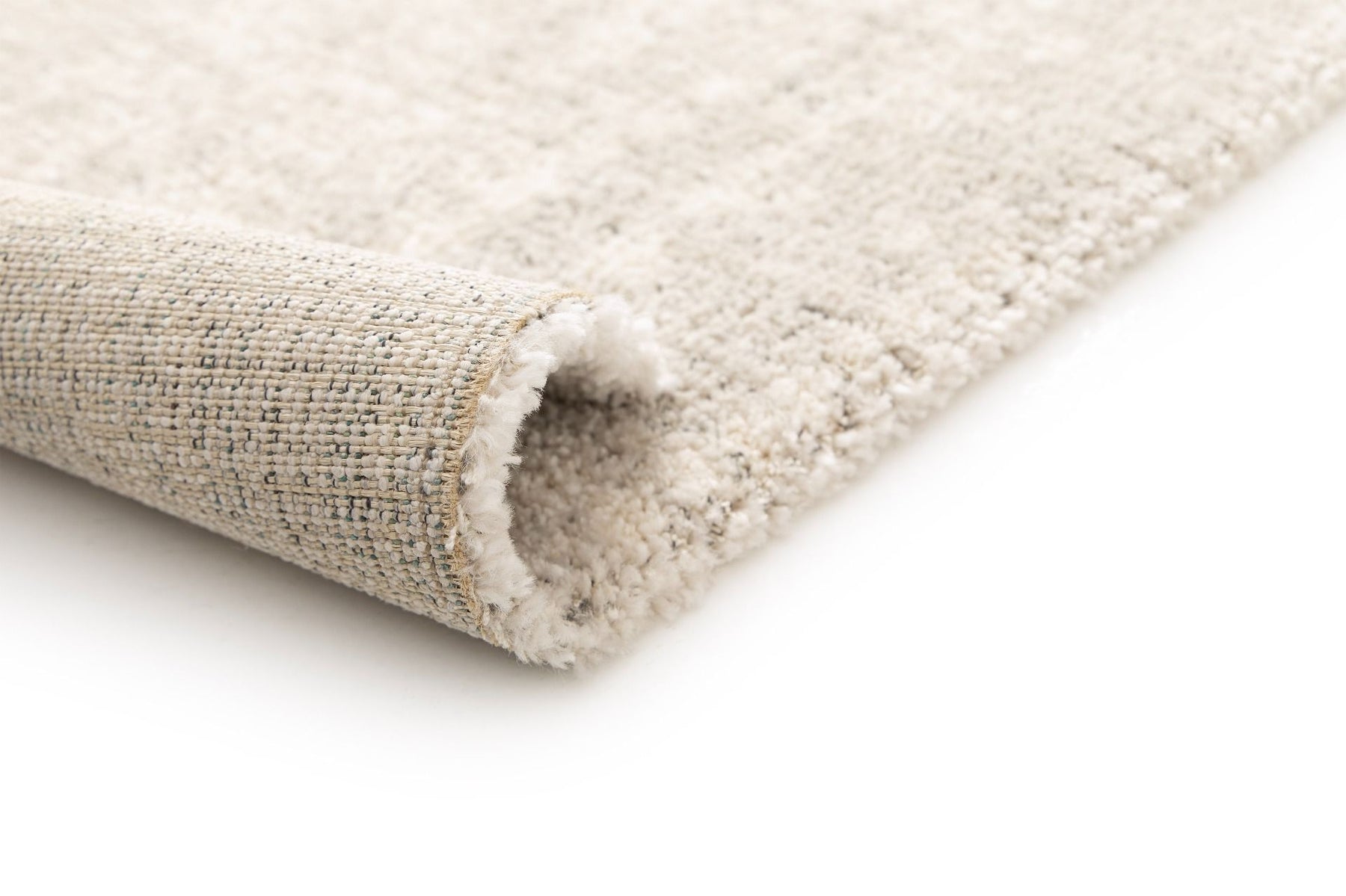 Close-up of a rug corner rolled to show the backing.