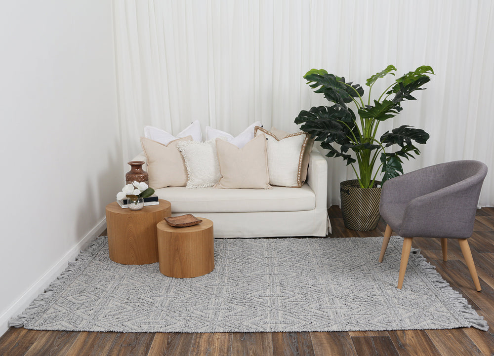 The Diego flatweave, is handmade in India with soft felted wool woven through cotton.