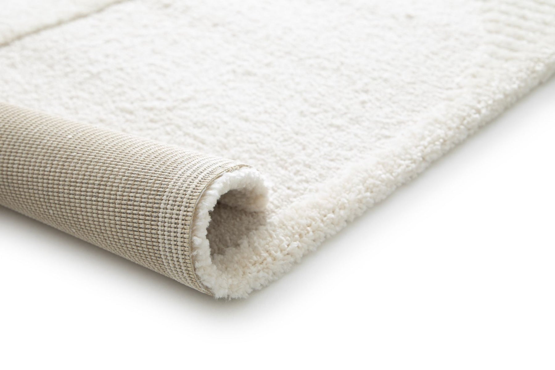 Rolled cream rug showing soft pile and backing.