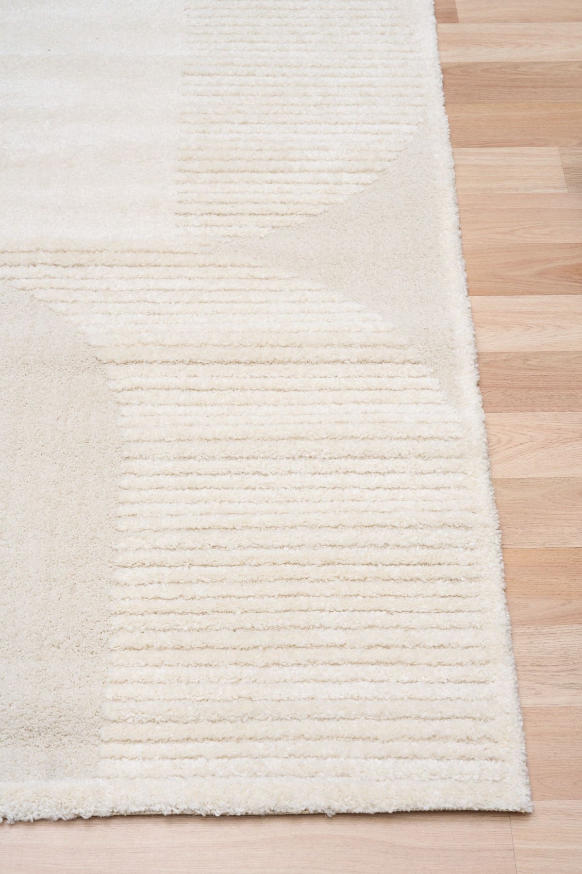 Cream rug with geometric patterns displayed at an angle.